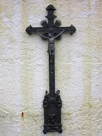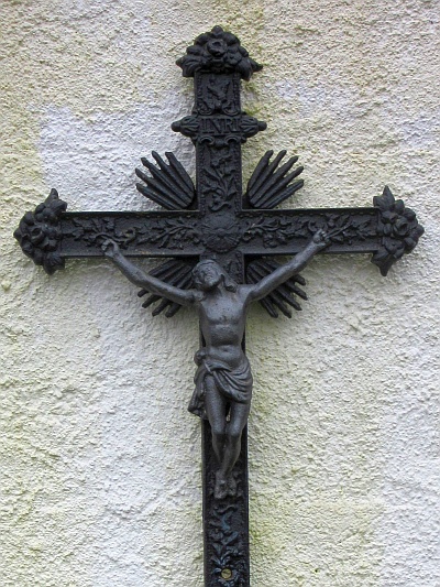 Ehemaliges Grabkreuz aus Eisen an der Friedhofsmauer auf dem neuen Friedhofsteil (ehemaliger Pfarrgarten).