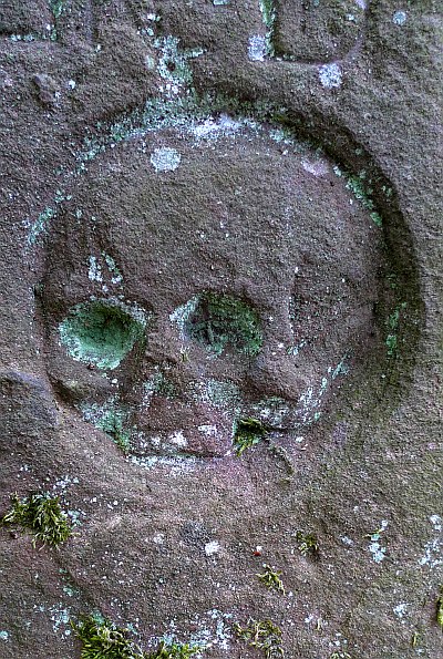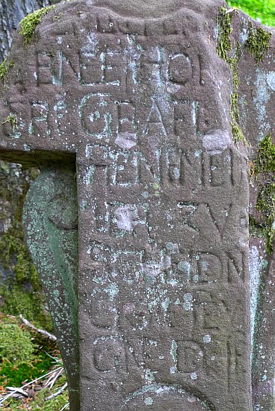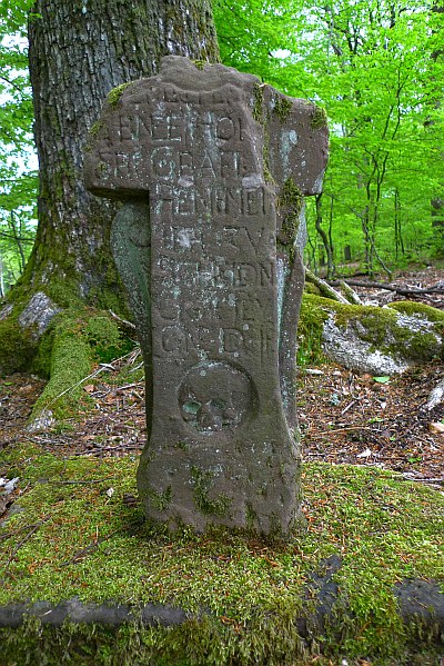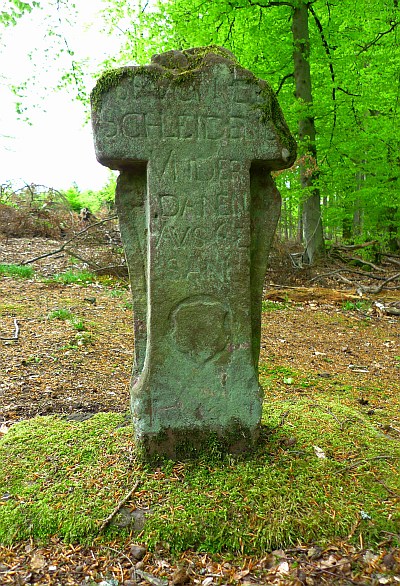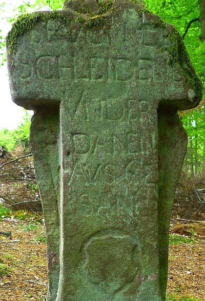Das Kreuz ist stark beschädigt, unter der Schrift auf der ersten Seite ist ein Totenkopf (Kennzeichen). Das auf der einen Seite befindliche Wappenschild ist leer. Sehr beschädigt; 0.60 Meter hoch.