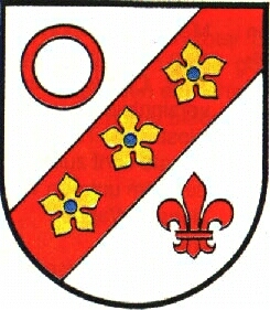 In silbernem Schild ein schräglinker, roter Balken, belegt mit 3 goldenen Mispelblüten mit blauen Butzen, oben begleitet von einem roten Ring, unten von einer roten Lilie.