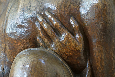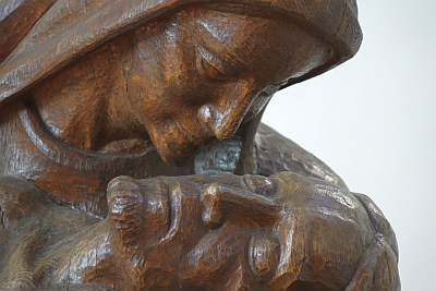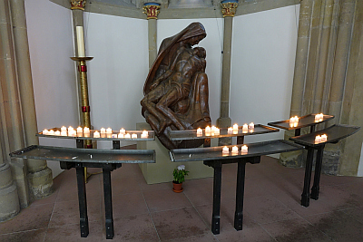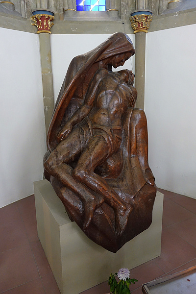 Pietà die eine materialikonographische Besonderheit aufweist, da sie aus den Resten von im Krieg herabgestürzter Balken des Glockenstuhls geschaffen wurde. [1]