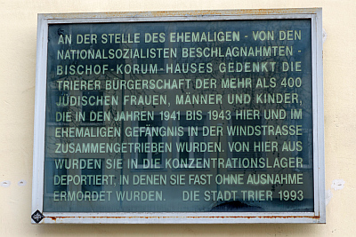 Tafel zur Erinnerung an die Deportation der Trierer Juden in den Jahren 1941 bis 1943. Vor dem Transport in die Ghettos und Konzentrationslager wurden die jüdischen Frauen, Männer und Kinder in das von den Nationalsozialisten beschlagnahmte und später abgerissene Bischof-Korum-Haus am Rindertanzplatz bzw. in das Gefängnis in der Windstraße gebracht: die Tafel war von 1993 bis 2020 an der Außenwand des Hauses Fetzenreich am Rindertanzplatz angebracht und wurde im Jahr 2020 durch ein neues, von Ralf Kotschka in Zusammenarbeit mit der jüdischen Kultusgemeinde Trier konzipiertes und am Rande des Platzes errichtetes Mahnmal ersetzt, das aus einem scheinbar willkürlich auf einem langgezogenen steinernen Sockel abgestellten Bronzekoffer und einer daneben angebrachten Bronzetafel besteht. Die ursprüngliche Tafel wurde von dem Künstler Thomas Kraft im Rahmen eines von der "Galerie KunstRaum Klaus Hinrichs" in Trier anlässlich des 50. Jahrestages der Vertreibung der Trierer Juden initiierten Kunstprojekts "Trier ist judenrein" im Dezember 1993 entworfen und als Mahnmal und sichtbarer Ausdruck bürgerschaftlichen Erinnerns am Haus Fetzenreich angebracht; die Tafel wie auch die in den Räumen der Galerie gezeigte Installation hatten das Ziel, den Besucher in einen kritischen Reflexionsprozess über das historische Ereignis zu involvieren.
