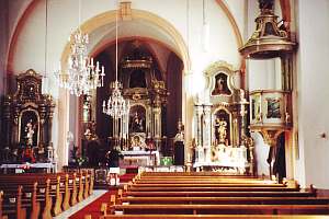 Die Kanzel wird überwölbt von dem Schalldeckel, auf dem sich die Darstellung des heiligen Erzengel Michael befindet. Im Chorraum hängen an den Seiten zwei Halbreliefs aus der Mitte des 18. Jahrhunderts; der Schmerzensmann und die Muttergottes. Zwei Beichtstühle aus frühklassizistischer Zeit – 1784 – und der schlanke Taufbrunnen, ebenfalls 18. Jahrhundert, gehören zum Inventar der Kirche.