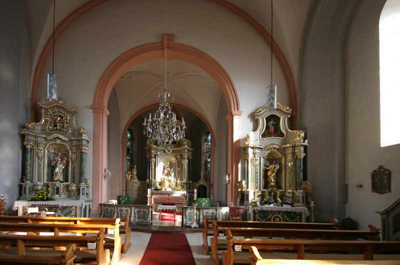 Die Kirche erscheint in den Steuerlisten des 14. Jahrhundert und im Visitationsprotokoll des Jahres 1569. Der vom Abt Michael Hormann von Echternach errichtet Neubau ist einschiffig, nach Zahlen am Portal und auf der Innenseite des Triumphbogens vom Jahr 1755/56. Dreiseitig geschlossenes Chorhaus (1761 fertiggestellt) und Westturm. Das Innere ist rippenlos kreuzgewölbt. Die drei Säulenaltäre stammen wie die Kanzel aus der Erbauungszeit. Ein neues Altarblatt für den Hochaltar malte 1837 Franz Dausch in Trier. Ein Taufstein in Becherform entstammt ebenfalls dem 18. Jahrhundert. Orgel um 1900 in barocken Formen. [2]