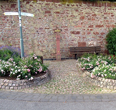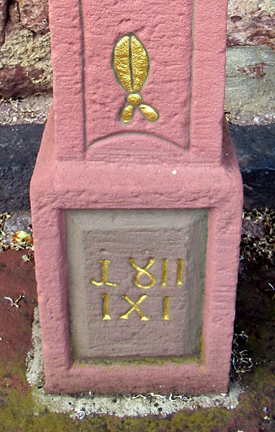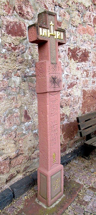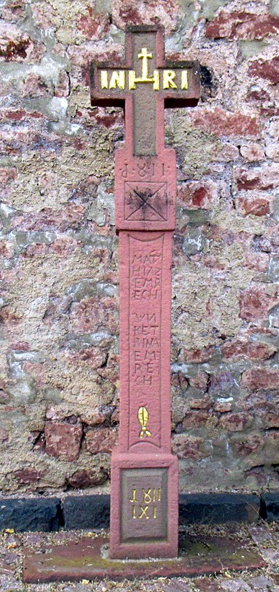 Zweihundert Jahre lang stand dieses zierlich wirkende Schaftkreuz im ehemaligen Schulgarten am Weinberg, zuletzt auf privatem Grund. Im Jahre 2011 machte ein Bauvorhaben am historischen Standort das Versetzen an diesen Ort erforderlich. Inschrift: