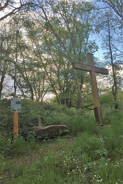 Das Kreuz wurde im Jahr 2014 wieder errichtet und neu eingesegnet, wie auf der Infotafel vor Ort zu lesen ist. Das neue Kreuz steht vermutlich etwas unterhalb des ursprünglichen Standortes, die zweite Sockelhälfte des alten Kreuzes wurde nämlich etwas weiter bergauf gefunden und dann nach unten gebracht. Die beiden Sockelhälften liegen nun zwischen Infotafel und Kreuz, wie auf einem der Fotos zu sehen ist. Das Kreuz steht etwas oberhalb eines breiten Waldweges und ist über eine betonierte Treppe zu erreichen. [2]
