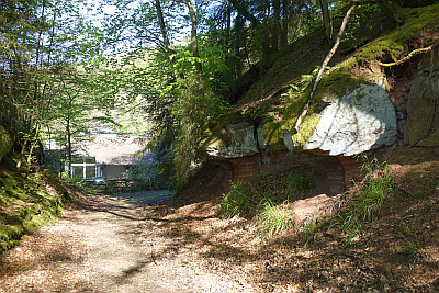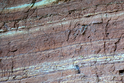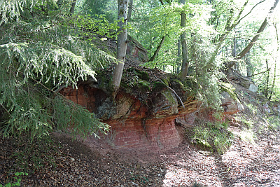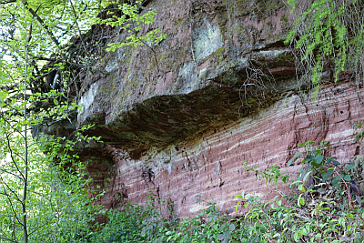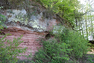 Mittelkörniger Sandstein. Wechselfolge aus rotbraunen, gelben und grauen Sandlagen verschiedener Körnung und Siltlagen. [1]