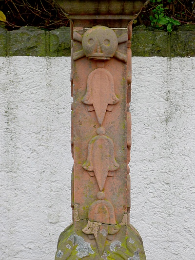 An drei Seiten des unten polsterartig verdickten Schafts die für den Typ charakteristischen Gehänge aus Glockenblüten. Abschlußkreuz mit Korpus und doppelt gespaltenen Balkenenden.