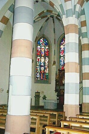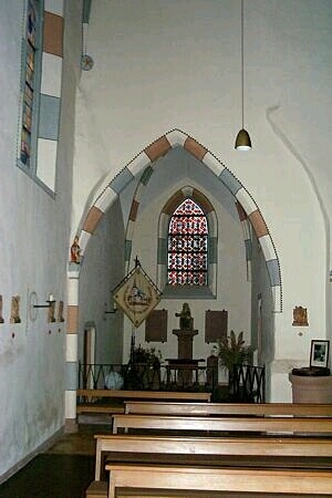 Den Westturm flankieren zwei niedrige Kapellenräume, die sich wie das Turmgeschoß mit großen Spitzbögen zum Langhaus öffnen. Vom Bau des 15. Jahrhundert sind sichtbar ein von Diensten flankierter Wandpfeiler an der Langhauswestwand sowie mehrere Gewölbedienste an der Seitenschiffsüdwand und im südlichen Chor erhalten.