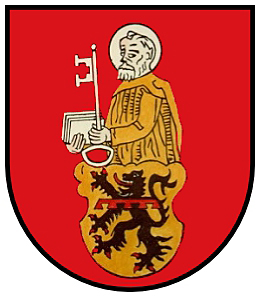 In rot ein goldener Schild, darin ein rotbewehrter schwarzer Löwe, belegt mit fünflätzigem, rotem Turnierkragen; darüber wachsend St. Petrus in goldenem Gewand mit silbernem Nimbus, silbernem Buch in der rechten und silbernem Schlüssel mit abgewendetem Bart in der Linken.
