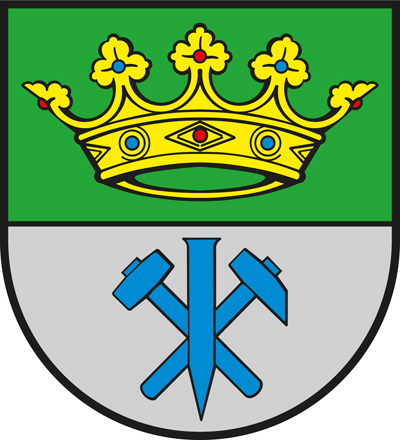 Wappenbeschreibung: Von grün über silber geteilt, oben eine mit blauen und roten Halbedelsteinen besetzte fünfzackige goldene Krone, unten in blau Schlägel und Hammer gekreuzt mit Meißel belegt.