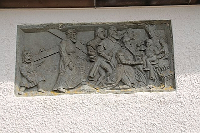 An der Außenwand des Windfanges befindet sich ein Relief aus grauem Sandstein, laut Wackenroder datierend aus dem 17. Jahrhundert, in vorzüglichem Zustand. Abgebildet sind die Darstellung der Anbetung der hl. drei Könige und die Kreuztragung als Sinnbilder der Verherrlichung und Erniedrigung Christi. Bis zum Bau des Windfanges befand sich das Relief über dem Haupteingang. [1]
