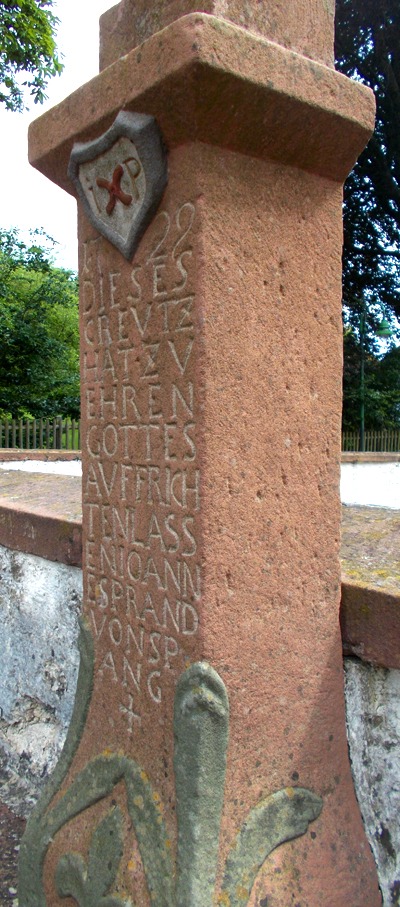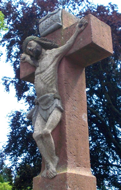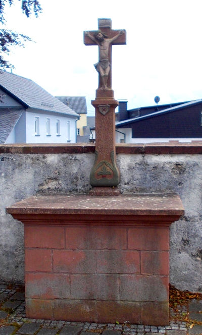 Schaftkreuz aus rotem Sandstein auf einem Altartisch, direkt an Begrenzungsmauer gelegen.