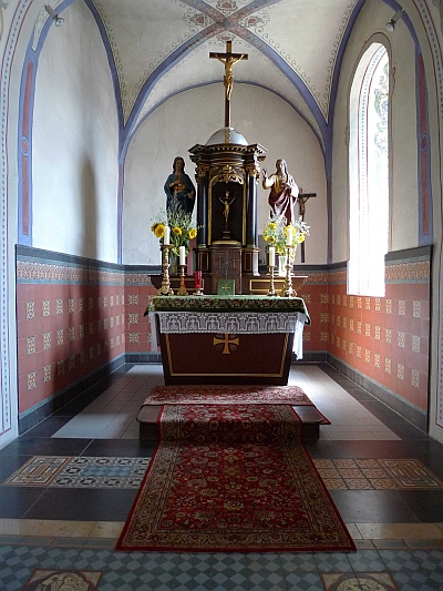 Der Chor ist rippenlos kreuzgewölbt und wohl erst beim Anbau des Schiffs kreuzbogig geöffnet. Das Schiff ist gerade gedeckt. Kanzel und Kommunionbank des 18. Jahrhundert wurden 1845 von ungekannter Stelle hierhergebracht. Ein erwähner Taufstein von 1662 ist nicht mehr vorhanden. [1]