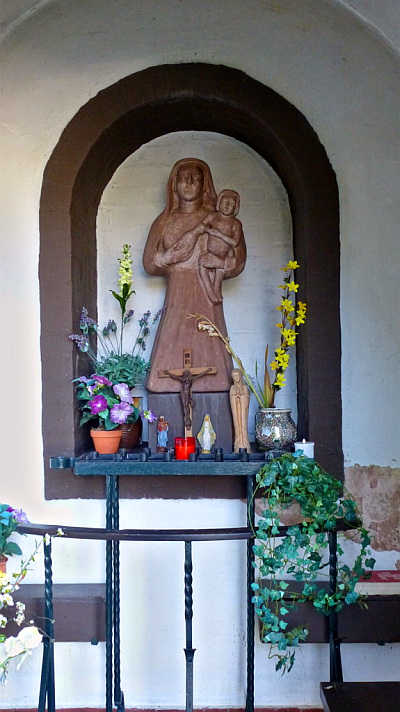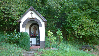 Banneux-Kapelle im Wald im Leukbachtal gelegen. Im Inneren eine Muttergottes-mit-Kind-Statue und weiteren Anbetungsdevotionalien.