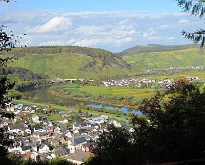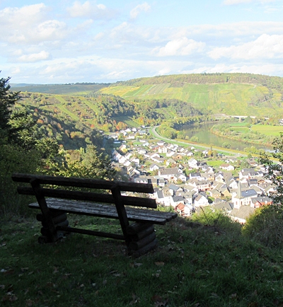 Aussichtspunkt Martinsberg am Abschlusskreuz des Stationsweges der acht Seligkeiten. Ausblick auf Ortschaften Ensch und Thörnich und Moselkrampen Richtung Klüsserath. [2]
