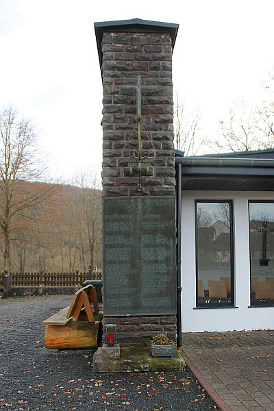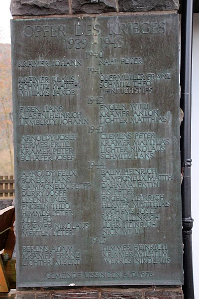 Schrifttafel für die Opfer des Krieges 1939-1945 an der Trauerhalle auf dem Friedhof.