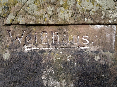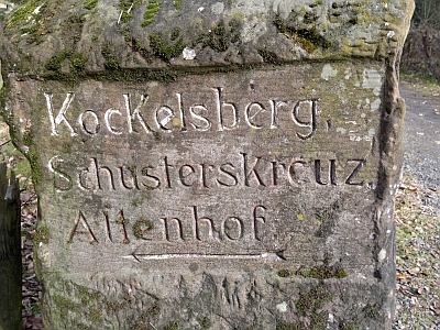 Der Wegweiser weist die Richtung zum Kockelsberg, zum Schusterskeuz, zum Altenhof und zum Weißhaus. [1]