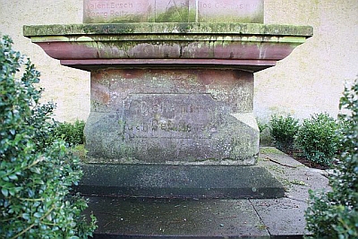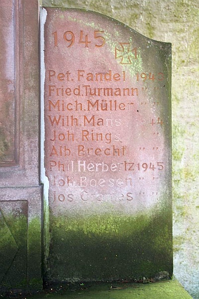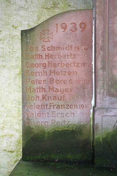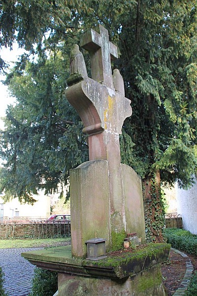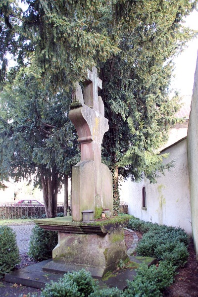 Es bildet das Zentrum eines nach den beiden Weltkriegen unter Verwendung älterer Grabsteine geschaffenen Kriegsdenkmals. Die Rückseite des Reliefbildes ist mit den Jahreszahlen 1813 ( Entstehung) und 1926 (Umnutzung) versehen. Der Schaft wurde offenbar 1926 ausgewechselt. Dabei ging eine Inschrift verloren (Chronogramm mit Datum 1813), die das Kreuz als Friedhofskreuz auswies. [1]