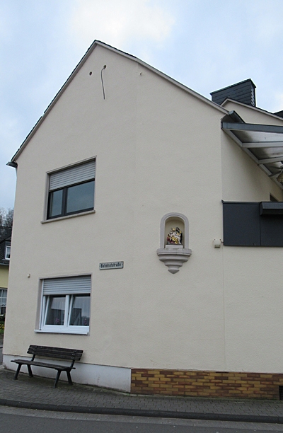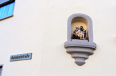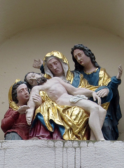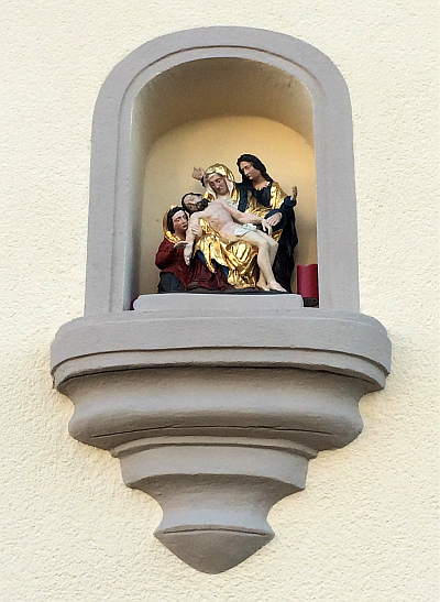 In einer Nische an der Giebelseite zur Straße hin befindet sich eine Nachbildung des aus dem 17. Jahrhundert stammenden Gnadenbildes der schmerzhaften Muttergottes von Klausen, den Leichnam Jesu im Schoß, gestützt von Magdalena, daneben Johannes.
