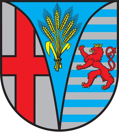 Amtlich beschrieben wird das Wappen folgendermaßen: gespalten durch eingestürzte blaue Spitze, darin eine sechsährige, goldene Getreidegarbe, vorn in Silber ein rotes Balkenkreuz, hinten vierzehnmal Silber und blau geteilt, belegt mit einem steigenden, gold bewehrt-, gezungt und gekrönten roten Löwen.