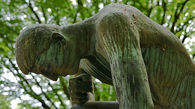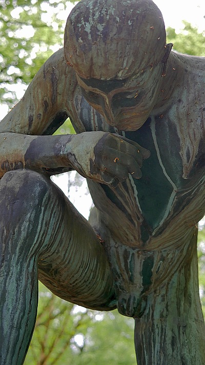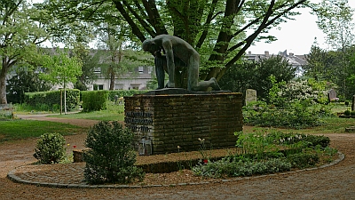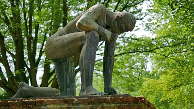 Die Bronzeskulptur des »Großen Knienden« wurde 1950 von Michael Trierweiler (1908–1998) geschaffen. Auf dem ehemaligen jüdischen Teil des Trierer Hauptfriedhofs platziert, fungiert sie als Denkmal für die Opfer der Gewaltherrschaft 1933-1945. Aus der Figur sprechen Schmerzen, Demütigung, Leid und Isolation – doch statt am Boden zu liegen, stützt sich der Mann mit letzter Kraft auf. [1]