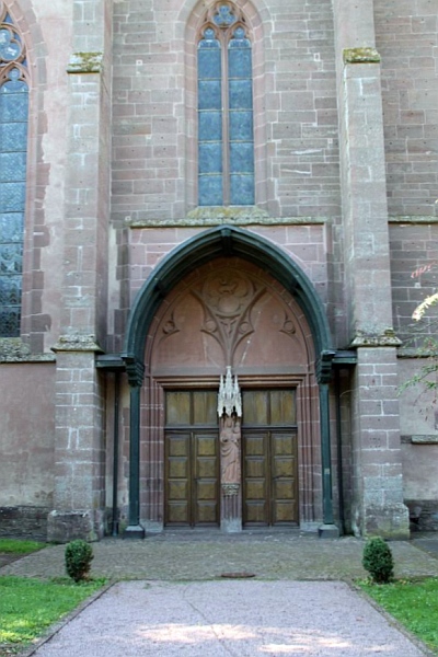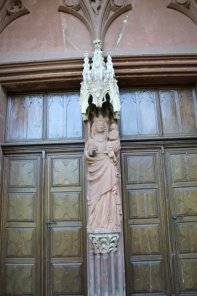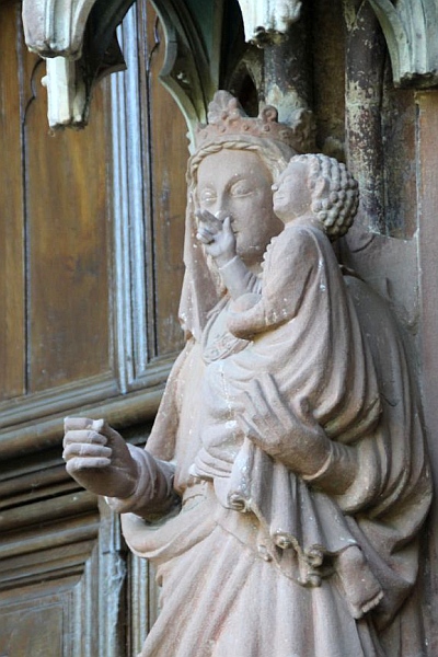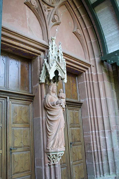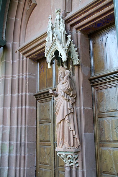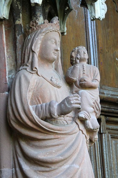 Dieses Doppelportal an der Nordseite war früher der Haupteingang. Das hohe, spitzbogige Tympanon wird von zwei großen Dreipässen gefüllt. Darunter die rechteckige Tür. Am Mittelpfosten die Steinfigur der Mutter Gottes. Im Gegensatz zum Gnadenbild über der Mensa "wirkt diese Portalmadonna robust, das Antlitz schaut mit etwas harten Zügen in die Ferne. Die Ende des 14. Jahrhunderts gearbeitete Figur, 1,63 m hoch, steht auf einer Blätterkonsole" [Wackenroder]. Der Baldachin in leichten Formen ist bereits stark verwittert. Im Dreipass zwischen den Spitzbogen das Salvatorlamm. Darunter im Zwickel, der von dem Spitzbogen gebildet wird, ein Kruzifixus zwischen Sonne und Mond. [1]