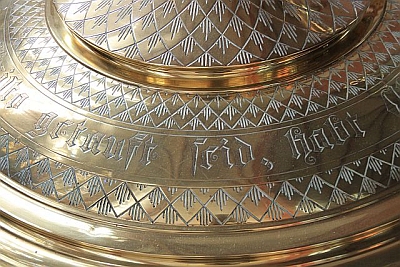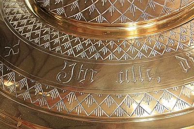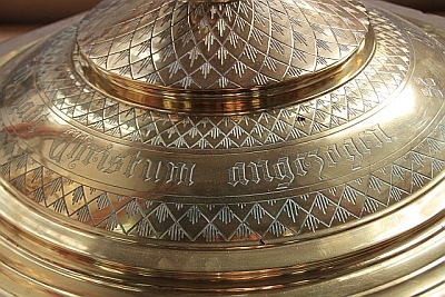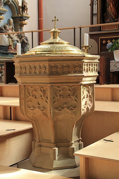 Er wurde 1887 von Bildhauer Franz Quirin angefertigt. [...] Auf dem Deckel hatte er eine Figur des hl. Johannes des Täufers, die jetzt (2006) an der Wand zwischen Chor und Seitenkapelle hängt. [2]