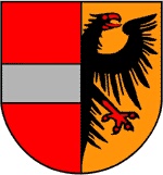 Gespalten von Rot und Gold vorne ein silberner Balken, hinten am Spalt ein halber rotbewehrter und -gezungter schwarzer Adler."