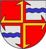 Geviert durch ein gold-rotes Pfeilspitzenkreuz in verwechselten Farben, 1 und 4 rot, 2 und 3 silber mit blauem Wellenbalken.