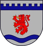 In silber ein goldgezungt- und -bewehrter steigender roter Löwe, im Schildhaupt ein blauer, oben gezinnter Balken, im Schildfuß ein blauer Wellenbalken."