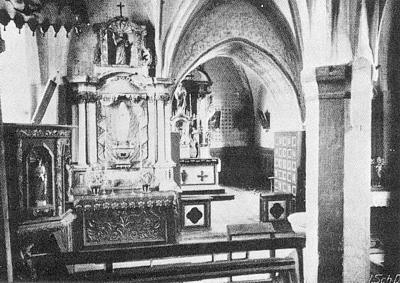 Starker 1829 gekappter Chorturm aus der 1. Hälfte des 13. Jahrhundert. Altar um 1732.