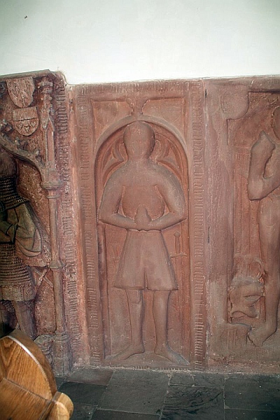 schildert: "in einem kurzen Kleid, kniend [das ist sicher falsch; es ist eine stehende Figur mit gefalteten Händen], den Kopf durch eine Sturmhaube verdeckt, mit Schwert und Dolch". Über einem Bogen oben rechts das Wappen von Brandscheid (3 Wolfsangel/Haken 2:1) und links ein Wappen mit einem Balken (Schannat-Bärsch: "Querhaken") nach Kdm. Lissingen (?).