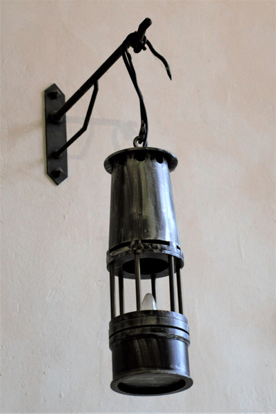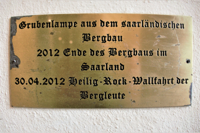 Die Grubenlampe erinnert an den Besuch von über 1200 Bergleuten aus dem Saarland am 30. April (2012) beim Heiligen Rock. Angebracht ist die Tafel neben einer Grubenlampe, ganz in der Nähe der Gräber der verstorbenen Weihbischöfe aus dem Saarland: Gerhard Jakob aus Hülzweiler und Karl-Heinz Jakoby aus Göttelborn. Beide Weihbischöfe stammten aus Bergmannsfamilien. Die Tafel erzählt den Besuchern des Kreuzganges auch vom Ende des Bergbaus an der Saar, sechs Wochen nach dem Ende der Heilig-Rock-Wallfahrt. [2]