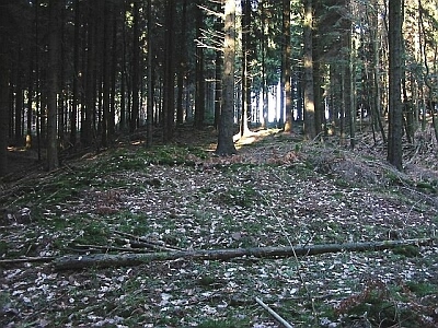 Das Foto zeigt die Überreste der Straße in der Gemarkung In der Hausbach bei Neidenbach. Der ehemalige Straßendamm mit den seitlichen Gräben ist auf dem Foto gut zu erkennen. [1]
