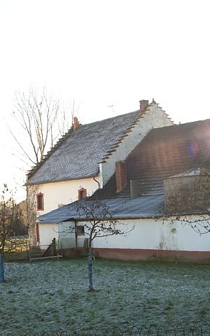 Wohnhaus, ehemals Stall und Backhaus eines um einen langgestreckten Hof gruppierten Streuhofs. Das in der Mitte seiner Traufseite über erneuerter Treppe erschlossene Wohnhaus mit zwei intakten Treppengiebeln stammt aus dem Jahre 1790, wie aus der Inschrift des entfernten Sturzes des Oberlichtportals hervorging. 1797/98 wurde das Gebäude nach Westen zu einem Streckhof erweitert, Stall und Scheune angebaut. Das Backhaus mit der darrüberliegenden Gesindewohnung (heute Schweinestall) kam 1824 hinzu. [1]