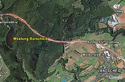 Auf einem Bergvorsprung, etwa 90 Meter über dem Kailbach, liegt 4 Kilometer wnw. von Landscheid ein unter dem Namen Burscheider Mauer bekannter und schon seit langem in der Literatur beachteter Ringabschnittswall in Form einer Ellipse, gut erhalten. Die Längsachse ist von Norden nach Süden gerichtet und mißt etwa 200 Meter bei 150 Meter größtem Breitendurchmesser. Die Breite des Walles selbst (harter Sandstein) beträgt im Nordosten, der Angriffsseite, noch 4 bis 5 Meter bei 2 bis 3 Meter Höhe; der vorgelegte Graben ist bis zu 3 Meter tief und 5 Meter breit. Kleiner ist der Wall dort, wo er um die Kuppe zieht. Niedrige Steinwälle liegen auf der dem Kailbach abgewandten Seite des Hauptwerkes, und zwar etwa 900 Meter südö. davon ein Wall von 300 Meter und im Nordosten einer von fast 500 Meter Länge, der von Westen nach Osten zieht. [2]