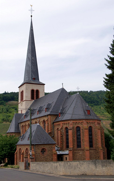 Neuspätromanische Schieferbruchstein-Basilika, 1906, Westturm von 1725; vier Pfarrergrabsteine, 19. Jahrhundert, steinernes Drehtabernakel. [1]
