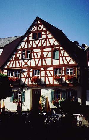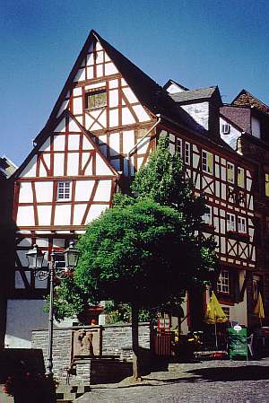 Hier stand bis Anfang der 70er Jahre das alte Rathaus (Amtssitz des Bürgermeisters des Amtes Zeltingen), später Feuerwehrgerätehaus. Nachdem es fast unbewohnbar war, wurde das Haus abgerissen und der Platz - zuletzt im Rahmen des Straßenbaus der Sankt Stephansstraße neu gestaltet - geschaffen. Ein Platz für viele Veranstaltungen in der Gemeinde: Konzerte, Frühschoppenkonzerte, offenes Singen für Gäste und Einheimische, oder Singen und Musizieren zur Weihnachtszeit, Eröffnung der Zeltinger Weinkirmes und ganz wichtig: es ist die malerische Kulisse für die Moseloperette Zeltinger Himmelreich. Die beiden Fachwerkhäuser: Das linke Haus dürfte wohl das älteste Haus in Zeltingen sein, wie es die Jahreszahl im Giebel ausweist: 1527. Im rechten Haus, der heutigen Ratsschänke war früher eine Bäckerei. Das Haus wurde nach dem Abriß des Rathauses von der Gemeinde übernommen und restauriert. So geben beide Häuser, wie auch die benachbarten Häuser dem Marktplatz das besondere Gepräge. [1]
