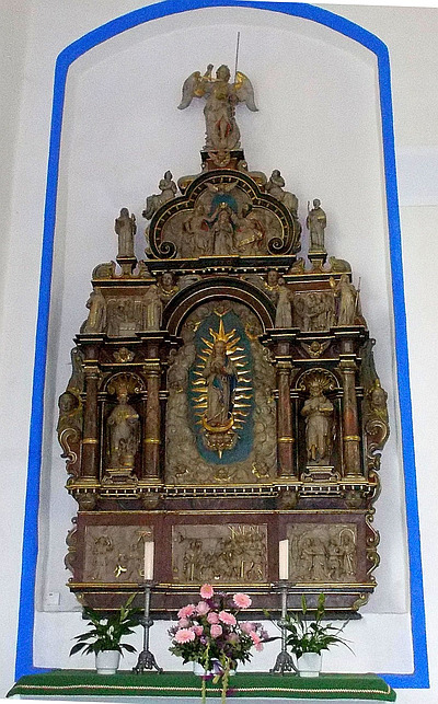 Langhaus von 1720, Sakristei 1640. Hochaltar aus Stein, 1627, wohl von Johann Ruprecht Hoffmann dem Jüngeren aus Trier. Fast lebensgroße Bischofsfigur mit Kirchenmodell. Auf dem Friedhof ein lebensgroßer Kruzifix.