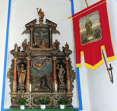 Langhaus von 1720, Sakristei 1640. Hochaltar aus Stein, 1627, wohl von Johann Ruprecht Hoffmann dem Jüngeren aus Trier. Fast lebensgroße Bischofsfigur mit Kirchenmodell. Auf dem Friedhof ein lebensgroßer Kruzifix.