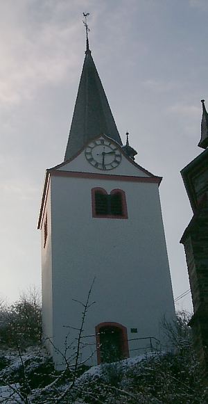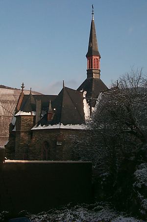 Erbaut 1884 unter Einbeziehung eines Turms aus dem 13. Jahrhundert Neugotischer, sechseckiger Zentralbau aus Schieferbruchstein. [1]