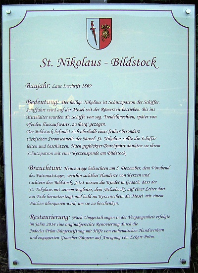 Der Bildstock befindet sich auf der linken Moselseite, gegenüber dem heutigen Wohnmobilstellplatz in der Gemeinde Graach. Schifffahrt wird auf der Mosel seit der Römerzeit betrieben. Bis ins Mittelalter wurden die Schiffe von sogenannten Treidelknechten, auch „Halfen“ genannt, auch mit Hilfe von Pferden, flussaufwärts „zu Berg“ gezogen. Vor Kanalisierung der Mosel (1958-1964) befand sich hier im Fluss eine besonders tückische Stromschnelle. Der heilige Nikolaus, als Schutzpatron der Schiffer, sollte die Schiffer hier sicher hindurch leiten und beschützen. Nach geglückter Durchfahrt an dieser gefährlichen Stelle dankten sie Ihrem Schutzpatron mit einer Kerzenspende am Bildstock. Noch heute beleuchten weithin sichtbar viele Kerzen am Vorabend des Nikolaustages den Bildstock. [1]