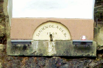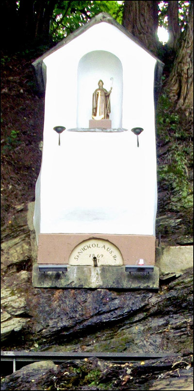 Dieser Bildstock mit der Figur des heiligen Nikolaus ist in einem Mosel-Schieferfelsen eingebaut und stammt aus dem Jahre 1869. Nach vielen Umgestaltungen in der Vergangenheit wurde er originalgerecht durch die Jodocus Prüm Bürgerstiftung (siehe hierzu : https://buergerstiftungbks.wordpress.com/) renoviert und am 20.07.2014 neu eingesegnet. Der gebürtige Wehlener Dr. Eckart Prüm als Mitstifter dieser Stiftung stellte bei der Einweihungsfeier die Bedeutung des Bildstocks anhand der neu angebrachten Informationstafel vor und wusste einiges über die Historie des Nikolaushäuschens zu berichten.