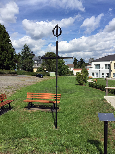 Das Turmkreuz der abgerissenen Thomas-Morus-Kirche hat eine sinnvolle Verwendung gefunden, es erinnert an eine historische und bedeutsame Glaubensstätte und hält damit auch ein Stück Geschichte wach. 2 Bänke laden zum Verweilen ein; ein Schild macht die Besucher auf die geschichtliche Bedeutung aufmerksam. [1]
