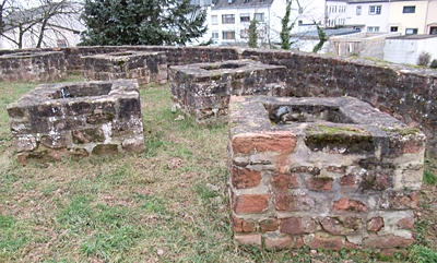 Befestigung um den erzbischöflichen Teil von Pfalzel, unter Einbeziehung eines mittelalterlichen Vorgängers des späten 14. Jahrhunderts bis 1539 errichtet, 1673/74 von den Franzosen unbrauchbar gemacht, 1961 Durchbruch zwischen Bastion 5 und 6, 1970–92 instand gesetzt; fast vollständig erhaltene Wallmauer (Erdwall zwischen zwei Mauern) mit aus der Mauerflucht heraustretenden Bastionen, Grabenbereich außen entlang der Wallmauer (heute weitgehend von Gärten und vom Friedhof eingenommen), Baumeister wohl Meister Peter (Erbauer des Roten Turms an der Kaiserstraße in Trier); die Befestigung beginnt an der Mosel mit Bastion 1, zieht sich hinter den Häusern östlich und nördlich von Klosterstraße, Scholasterei und Golostraße, verstärkt durch die Bastionen 2 bis 5, bis zur Endbastion 6 hinter Golostraße 3 und 5 bzw. Residenzstraße 25 [2]