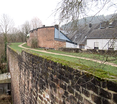 Befestigung um den erzbischöflichen Teil von Pfalzel, unter Einbeziehung eines mittelalterlichen Vorgängers des späten 14. Jahrhunderts bis 1539 errichtet, 1673/74 von den Franzosen unbrauchbar gemacht, 1961 Durchbruch zwischen Bastion 5 und 6, 1970–92 instand gesetzt; fast vollständig erhaltene Wallmauer (Erdwall zwischen zwei Mauern) mit aus der Mauerflucht heraustretenden Bastionen, Grabenbereich außen entlang der Wallmauer (heute weitgehend von Gärten und vom Friedhof eingenommen), Baumeister wohl Meister Peter (Erbauer des Roten Turms an der Kaiserstraße in Trier); die Befestigung beginnt an der Mosel mit Bastion 1, zieht sich hinter den Häusern östlich und nördlich von Klosterstraße, Scholasterei und Golostraße, verstärkt durch die Bastionen 2 bis 5, bis zur Endbastion 6 hinter Golostraße 3 und 5 bzw. Residenzstraße 25 [2]
