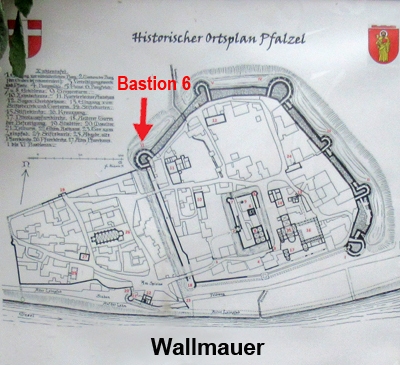 Die mächtige sogenannte Wallmauer (Artilleriewall) wurden zwischen 1531 und 1539 unter Kurfürst Johann von Metzenhausen zum Schutz des kurfürstlichen Teils von Pfalzel samt der Burg, wahrscheinlich nach der Befestigungslehre Albrecht Dürers erbaut. Nachdem in den Jahren 1672 bis 1689 französische Truppen den Ort erorberten und zerstört hatten, begann der Verfall der schwächeren Teile der Wallbefestigung. Sie umfasst noch heute 6 Geschützbastionen, die im Inneren voneinander unabhängig mehrere Geschützstellungen sowie Mannschaftsräume und Pulverkammern aufweisen. Die Gesamtanlage war durch einen Wassergraben umgeben, der heute noch östlich der Wallmaueranlage erhalten geblieben ist. [3]