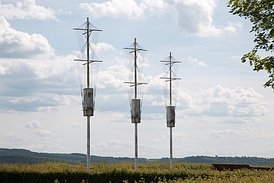Bernd Bleffert (*1955) fertigte die Windharfen in Zusammenarbeit mit dem Architekten Herbert Hofer (*1967) und dem Musiker Thomas Rath für die Daueranlagen der Landesgartenschau Trier im Jahr 2004 an. Auf einem Plateau des Petrisberges, direkt an einer Flaniermeile gelegen und daher auch angenehm fußläufig zu erreichen, findet sich eine Installation, welche gleich drei dieser Klangkörper umfasst. Eindrucksvolle acht Meter über den Erdboden ragen drei, in einer Reihe angeordnete, konische Stahlrohre schwindelerregend gen Himmel. [1]