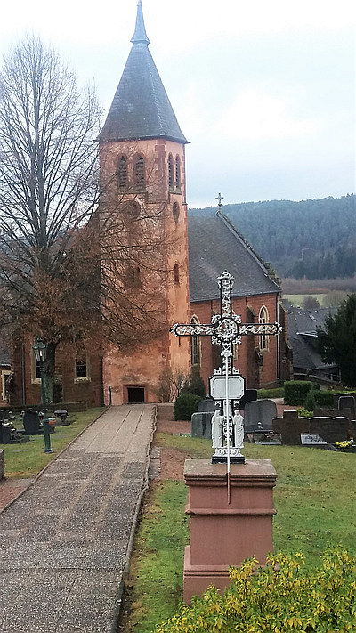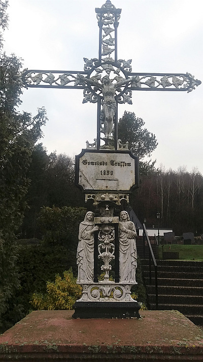 Im Friedhof das mit GEMEINDE TRASSEM 1890 bezeichnete Friedhofskreuz. In dieser Art seltenes filigranes gußeisernes Kreuz pfeilerartigem Rotsandsteinsockel. Die Kreuzbalken in Blatt- und Rankenornamenten durchbrochen; Korpus und die am Kreuzfuß angelehnten Figuren der Maria und des Johannes ebenfalls aus Gußeisen. [1]