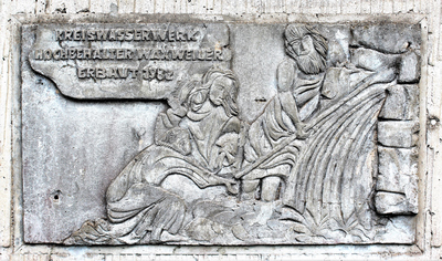 Die Quelle der im Jahr 1904 erbauten Waxweilerer Wasserleitung fasste man 1921 in einem Hochbehälter unterhalb des Heiligenhäuschens neu. Die Stilllegung dieser Leitung und Anschluss des Ortes an das Kreiswasserwerk erfolgte 1966. Um die Wasserreserve erhöhen zu können baute man im Jahr 1982 einen neuen Hochbehälter auf der Anhöhe „Im Geisenberg“ zwischen Waxweiler und Pintesfeld. Dieses kommunale Gebäude ziert eine interessante Steinplatte, die der bereits verstorbene Prümer Künstler Walter Zimmer entworfen hat. Das Motiv stellt die biblische Szene dar, in der Mose und Aaron aus einem Felsen Wasser sprudeln lassen.